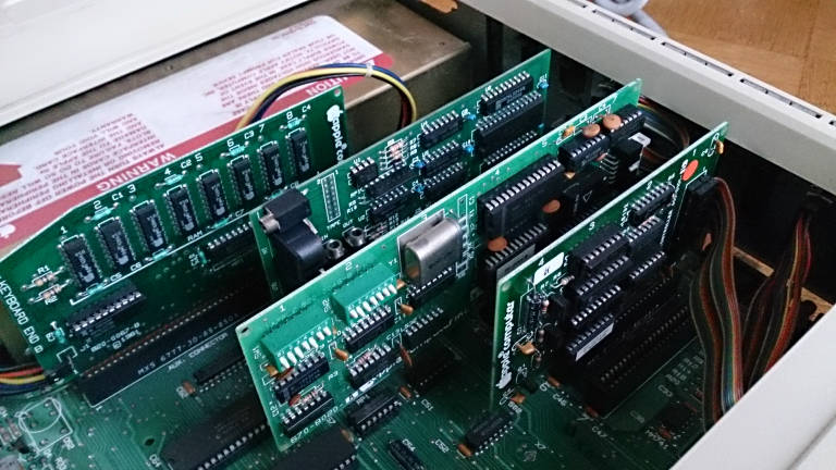 1984年製と思われるAppleIIeを米国より購入。輸送代と税金が掛かったが、今のうちに手に入れとかないと、もう益々入手困難になるかなぁと思い決断。外観程度はご覧の通り、なかなか綺麗。電源も入りちゃんと動作する。困ったことにDOS 3.3が付属していない、、、orz 誰か持ってないっすか?w さすがにDOS無いと辛い。取り合えず、DOS無しでROM BASICで動かしてみると、まぁ、懐かしいこと。BASICでちょっと遊んでみるが、意外と覚えてるw 整数BASIC ROMが無いので、ミニアセンブラとかは試せないけど、DOSがあればランゲージカードに読み込んで動かせるんだよなぁ。スロットには80桁/64K RAMカード、SuperSerialカード、DISKカードともう一枚、謎のカードがささってる(これは何だ?Sound系かなぁ、モッキンバードではないと思う)。