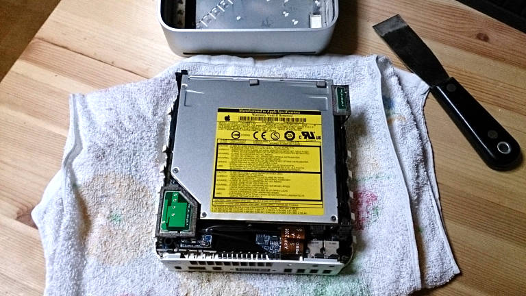 HDD(200G)の容量も残り少なくなってきたので、容量の大きいもの(750GB)に換装するついでに思い切ってMac miniをLinux化することに。この借り物Mac miniはCPUがCore SoloのIntel Mac初期モデル(2006年式?)だと思われる。まずは換装するHDDを外付けして、最小容量でMacOSをインストールする。本体を分解してHDDを換装し、起動出来るのを確認後、rEFItを入れる。再起動するとrEFItのブートメニュー画面が出た。これで第一段階クリア。