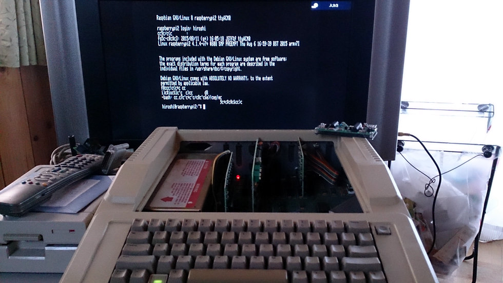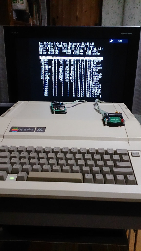 何か安価で現実逃避ができないもの役に立たないものかと思ったのがシリアル端末。実用的だし、幸い家のIIeにはSuperSerialCardIIが付いている。そこで、modemMGRというアプリを入手しラズパイとシリアルケーブルで繋いで試行錯誤の結果、何とかAppleからラズパイにログイン出来るようになった。ロケールが日本語のままなので全角文字が化けてしまうが、一応端末として機能している。