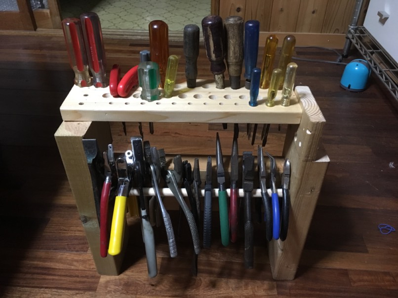 古いのやら何やら工具類が発掘された、、、中には使い道のわからないものもw 取り敢えず、使いそうなものだけ収納できるスタンドを作る。廃材を使ってのやっつけ仕事なので見栄えは悪いが、ま、道具の整理は出来た。
