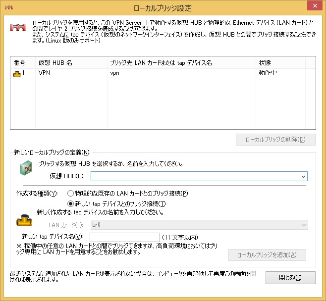 今のうちにメモしとこうw 前のラズパイやMac miniサーバー時代に入れていたのだが、nucには入れてなかった。仮想DHCPやNICに普通にブリッジするだけなら簡単なのだが、それだとvpnクライアントからサーバ本体のNICにアクセス出来ない制限がある。そこでブリッジとtapを使って設定すると鯖のNICにもアクセスできるようになる。まずは鯖のLinuxで物理NICに対してbr0を作っておく、vpnserverの設定でtapを設定する。vpnserverが起動するとtapを作ってくれるので、それをbr0にaddする。