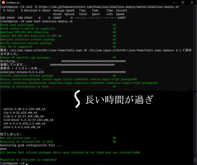 そのままCentOS Streamに移行するか、CentOS7にダウングレードするか、別のディストリに乗り換えるか検討した結果、現状のCentOS8からマイグレでAlmaLinuxに置き換える方法を採用。一か八かではあるが一番楽そう(用意されているscriptを実行するだけ)だったので不精者にはもってこいだ。まぁ、どちらも元はRHEL8なのでパッケージ類も似たようなもんなんだろう。少々時間は掛かったが特に警告もなく完了、再起動して無事立ち上がった。