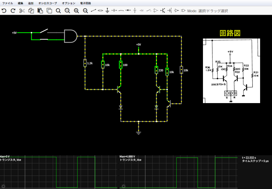 KBのカナ、英数の切り替えインジケーターの回路図があったのでWebで使えるシミュレータで試してみる。ふむふむ、理屈は知らんが確かにLEDは切り替わりそう、、、ところで、右側のTrは何故二段構えになってるの?