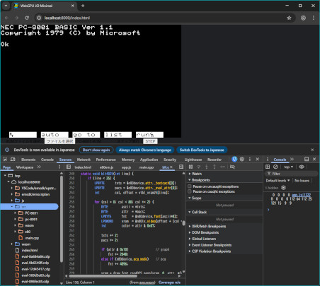 WebAssemblyと組み合わせてみる実験。Emscriptenのemccを使えばwasmが作成できるので既存のコードからハード依存部を除いてコンパイルしてみるとあっさり通る。jsとwasmの橋渡しだけすれば普通に動く。ChromeのDevToolでソースレベルでブレークポイントは止められるが、変数名が出せないので実用的なデバッグは難しい。