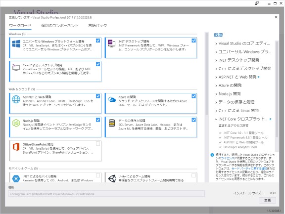 その前に仮装マシンのWin10がAnivUpdateが掛かっておらず、延々と更新作業が続く、、、、そしてVS2017のインストールであるが、今回MSDNサブスクリプションのサイトにあったのはsetup用のexeであり、いつものisoファイルではなかった(2015の時もそうだったかな?すっかり忘れたけどw)。なんか、いつもとちょっと違う雰囲気のインストール科目選択画面、どういうわけかLinuxの開発用とかの選択肢もある。インストールそのものはすんなり終了。
